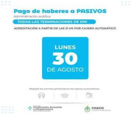 Por séptimo mes consecutivo, el Gobierno del Chaco paga haberes antes de finalizar el mes.El cronograma de pago de salarios a la Administración Pública Provincial comenzará el próximo lunes 30 de agosto, con la acreditación a trabajadores pasivos. Un día después, el martes 31, se abonará al sector activo de las y los empleados públicos, sin diferenciación de DNI.