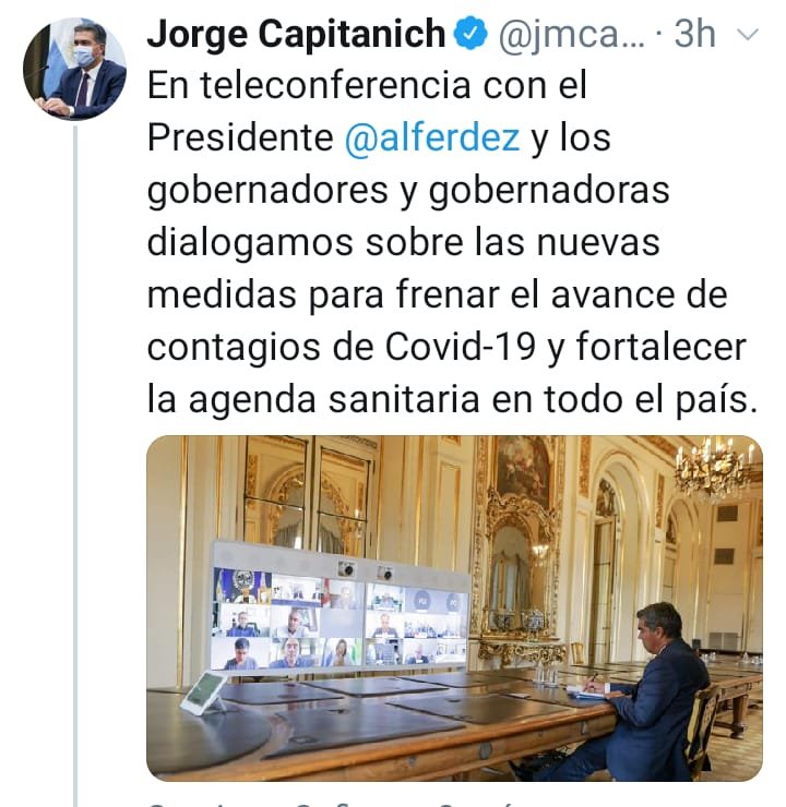 Así, debatieron las nuevas medidas Larreta y Kicillof y sus pares de Catamarca, Raúl Jalil; Chaco, Jorge Capitanich; Córdoba, Juan Schiaretti; Corrientes, Gustavo Valdés; Entre Ríos, Gustavo Bordet; Formosa, Gildo Insfrán; Jujuy, Gerardo Morales; La Pampa, Sergio Ziliotto; La Rioja, Ricardo Quintela; Mendoza, Rodolfo Suárez; Misiones, Oscar Herrera Ahuad; Neuquén, Omar Gutiérrez; Río Negro, Arabela Carreras; Salta, Gustavo Sáenz; San Luis, Alberto Rodríguez Saá; Santa Fe, Omar Perotti; Santiago del Estero, Gerardo Zamora; y Tucumán, Juan Manzur.