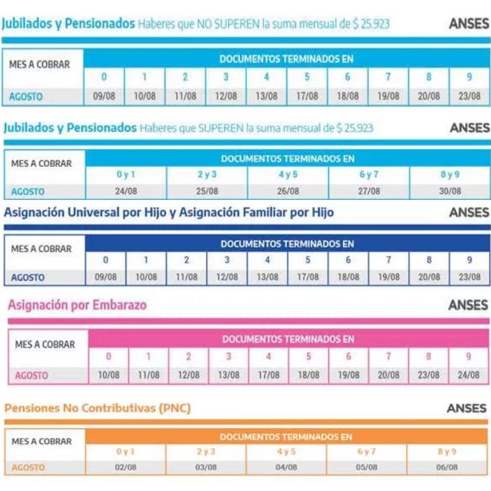 La Anses dio a conocer este jueves el calendario de pagos completo del mes de agosto, tanto para jubilados y pensionados, como también para titulares de la Asignación Universal por Hijo (AUH), Asignaciones Familiares, Asignación por Embarazo, y beneficiarios de Pensiones No Contributivas (PNC).La agenda de pagos comenzará el lunes 2 de agosto, con beneficiarios de pensiones no contributivas (PNC), con documentos finalizados en 0 y 1.