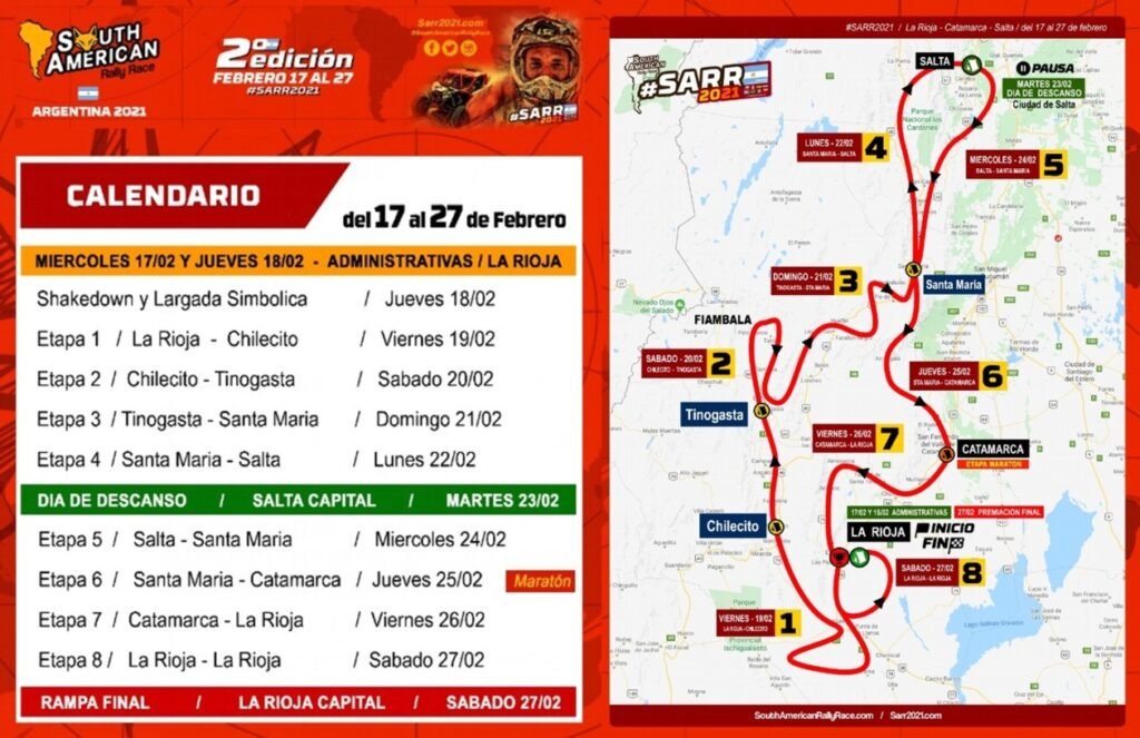 Luego del denominado Shakedown en el autódromo de La Rioja y la rampa de partida prevista para este jueves, la etapa inicial será el viernes y unirá La Rioja con Chilecito, a través de 382 kilómetros (176 km de velocidad). Las restantes etapas serán: sábado 20 / Chilecito-Tinogasta (434 km) y (284 km de velocidad), domingo 21 / Tinogasta-Santa María-Catamarca (500 km) y (312 km de velocidad), lunes 22 / Santa María-Salta (465 km) (263 km de velocidad).