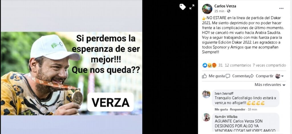 Carlos Verza no será parte del Rally Dakar 2021. El “Yaguareté” lo confirmó mediante las redes sociales que la cancelación del vuelo que debía trasladarlo hacia Arabia Saudita, lo privó de su séptima participación consecutiva en la prueba más extrema del planeta.No estaré en la línea de partida del Dakar 2021. Me siento deprimido por no poder hacer frente a las complicaciones de último momento. Hoy se canceló mi vuelo hacía Arabia Saudita. Voy a seguir trabajando con más fuerza para la siguiente Edición Dakar 2022. Les agradezco a todos Sponsor y Amigos que me acompañan Siempre!!!”