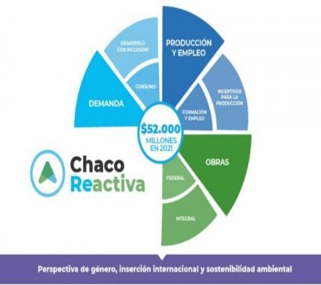 En ese marco y bajo esas dos premisas es que se pone en marcha “Chaco Reactiva” con una inversión de 52 mil millones de pesos para mejorar el mercado interno, potenciar la producción y el empleo y desarrollar el plan de obras públicasmás ambicioso de los últimos años. Adicionalmente, esta propuesta se basa en tres ejes transversales: perspectiva de género, inserción internacional y sostenibilidad ambiental.