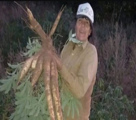 El tubérculo de gran tamaño creció en la zona rural de Goya Alicia Barbona del paraje Ñaembé, a 25 kilómetros de Goya, cosechó este martes una mandioca de 1 metro de largo. “Estoy muy orgullosa de ser mujer campesina y vivir en el campo” aseguró.
