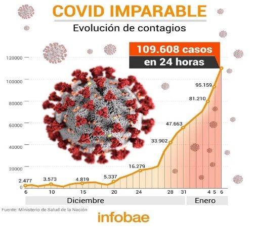 Con 109.608, el país duplicó la cifra de nuevos casos en una semana. Además se informaron 40 muertes. Así, el total de infectados desde el inicio de la pandemia asciende a 6.025.303 y los fallecimientos son 117.386El Ministerio de Salud de la Nación informó este jueves 6 de enero que, en las últimas 24 horas, se registraron 40 muertes y 109.608 contagios de coronavirus. A un año y diez meses del inicio de la pandemia y con más de 33 millones de vacunados con el esquema completo, Argentina superó los 100 mil casos diarios de COVID-19 por primera vez y duplicó la cifra de contagios en una semana.
