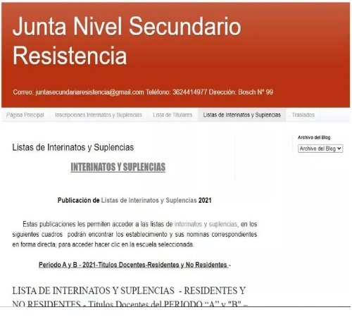 La junta de clasificación Nivel Secundario, Sede Resistencia, comunica a los docentes que ya se encuentran publicadas las respectivas listas de Interinatos y Suplencias, Periodo A y B 2021, en el sitio web de la Junta: https://juntanivelsecundarioresistencia.blogspot.com/.El Ministerio de Educación informó además que para cualquier reclamo, hay que dirigirse por correo electrónico a: tachasecundariaresistencia@gmail.com.