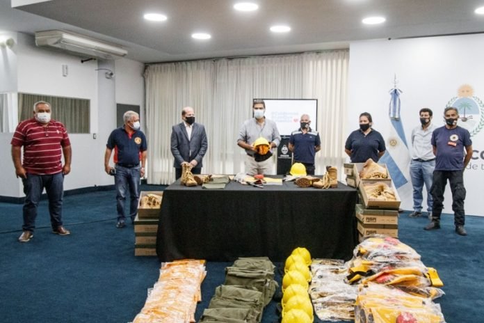 Se entregaron hoy cinco equipos de protección personal (mochilas, borcegos, camisas y pantalones), de un total de 46 conjuntos que serán entregados en los próximos días a los 23 cuarteles de la provincia. En tanto que la semana próxima se entregarán vales por 4600 litros de combustible y se iniciará un relevamiento físico de los cuarteles para proceder a su refacción.