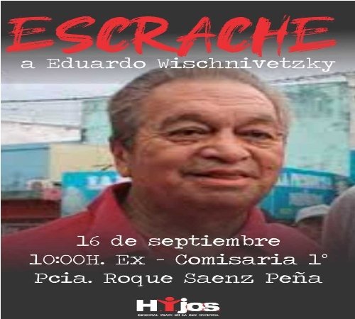 La organización H.I.J.O.S señalará la casa del exrepresor, quien goza de prisión domiciliaria, pero “incumple con la medida”, según algunos testigos. “Se lo puede ver circulando libremente por la ciudad”, aseguran desde la agrupación de Derechos Humanos.H.I.J.O.S. Regional Chaco convoca a vecinas y vecinos a participar del escrache a Eduardo Wischnivestky, represor condenado a 18 años de prisión por secuestros y torturas durante la dictadura cívico-militar; este jueves 16 de septiembre, a las 10, en la Ex Comisaría 1° de Sáenz Peña. El lugar que funciono como Centro Clandestino de Detención junto con la Alcaidia, todo dentro del área conocida como “la Manzana Policial”, desde allí se marchara hasta la casa del genocida ubicada en Rivadavia 744.