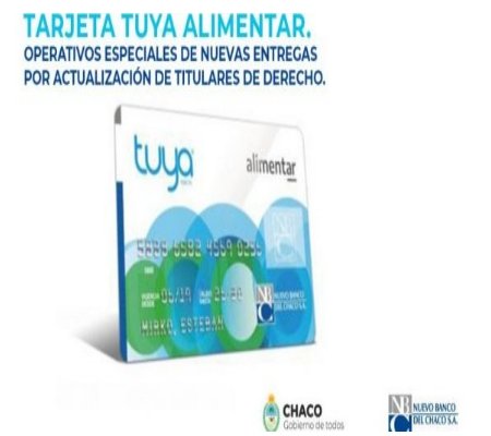 Este martes 22 de junio, se iniciará un nuevo cronograma de entrega de Tarjetas Tuya Alimentar para nuevos titulares de este derecho dados de alta por Anses, en diferentes localidades de la provincia. Los operativos son organizados en forma conjunta por el Ministerio de Desarrollo Social de la Provincia y el Nuevo Banco del Chaco (NBCH), con la colaboración de municipios y la Policía del Chaco.De esta manera aproximadamente 4 millones de familias en situación de vulnerabilidad reciben contención del Estado Nacional. En Chaco las tarjetas ascenderían a un total de 106 mil titulares de derecho alcanzados a la fecha. Las y los nuevos titulares de derecho deben verificar las altas en el siguiente enlace: