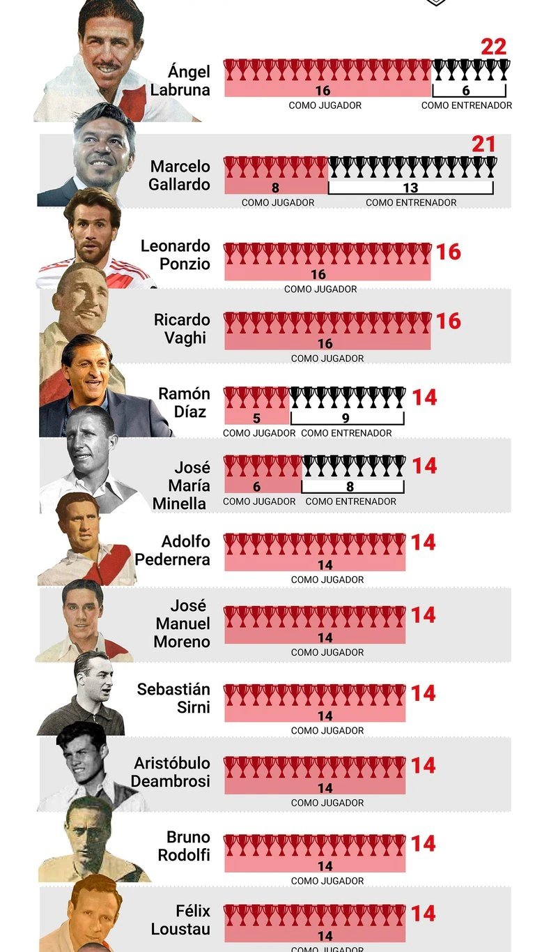 En toda su vida, la entidad de Núñez ganó 68 títulos (50 a nivel local y 18 en el plano internacional) y Marcelo Gallardo dijo presente en 21 de ellos, ya que a los 13 mencionados como DT hay que sumarle ocho como futbolista: cuatro Torneos Apertura, dos Torneo Clausura, una Copa Libertadores y una Supercopa Sudamericana. Por consiguiente, quedó a sólo uno de alcanzar a Ángel Labruna, quien lidera esta prestigiosa tabla con un total de 22 estrellas (16 como jugador y 6 como entrenador).
