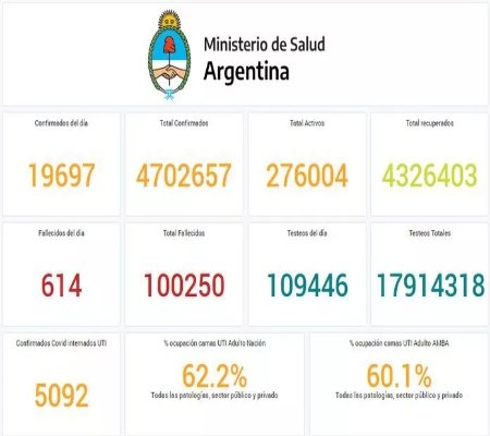 La Argentina superó este miércoles 14 de julio de 2021 las 100 mil muertes por coronavirus, según los datos oficiales difundidos por el Ministerio de Salud de la Nación, que reportó 614 nuevos fallecidos y otros 19.697 contagios en las últimas 24 horas.Con estos datos, el número de víctimas fatales desde que comenzó la pandemia ascendió a 100.250, mientras que el total de personas infectadas en el país subió a 4.702.657.