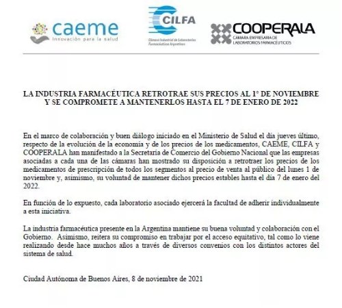 “La industria farmacéutica mantiene su buena voluntad y colaboración con el Gobierno. Asimismo, reitera su compromiso en trabajar por el acceso equitativo, tal como lo viene realizando desde hace muchos años a través de diversos convenios con los distintos actores del sistema de salud”, afirmaron en el escrito.