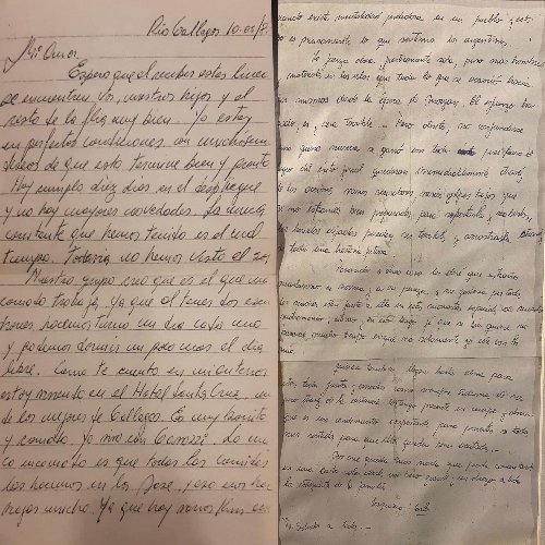 Les escribo para enterarlos de mi vida por la cual ustedes se preocupan y yo muchas veces, por diversas causas, no reparo en ese especial interés.A través de Norma se habían enterado que estoy en San Julián (Prov. de Santa Cruz). A esta pequeña ciudad llegué el 1 de mayo que coincidió con la gran ofensiva argentina contra los ingleses, los cuales tuvieron que replegarse puesto que el asunto no viene tan fácil como ellos creyeron en un principio. Particularmente no estaba habilitado para el combate pero insistí y logré hace cinco días que me habilitaran.