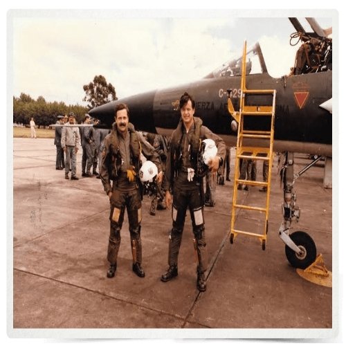Castillo cumplió con su primera misión de combate el 21 de mayo. Lo hizo junto al capitán Rubén Dimeglio, piloto instructor. Una foto anterior a la guerra los muestra juntos, posando frente a un Dagger:
