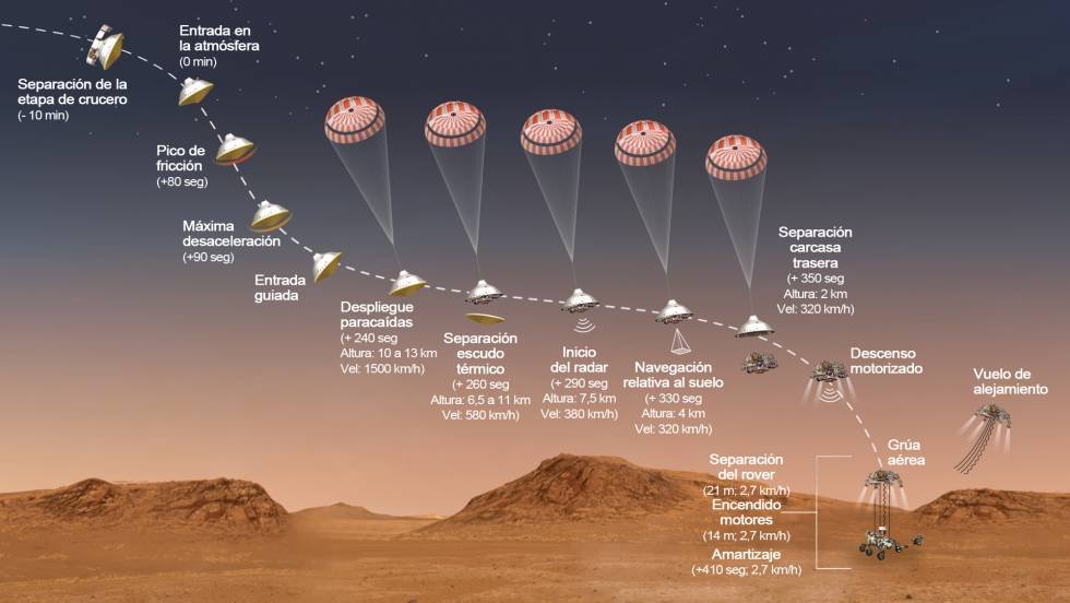 El vehículo robótico navegó por el espacio durante casi siete meses, recorriendo 472 millones de kilómetros antes de atravesar la atmósfera marciana a 19.000 km por hora para iniciar su aproximación a la superficie del planeta.