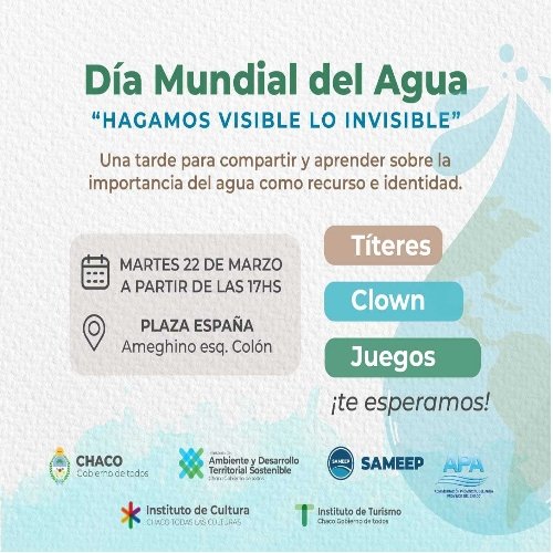 El Ministerio de Ambiente y Desarrollo Territorial Sostenible, la Administración Provincial del Agua (APA) y la empresa SAMEEP, llevarán adelante el próximo martes 22 de marzo en la Plaza España la jornada por el Día Mundial del Agua. Participarán además los institutos de Cultura y de Turismo de la provincia.Este año, el foco está centrado en las aguas subterráneas, que, si bien se ocultan a simple vista, sus efectos se aprecian en todo el mundo. Las mismas se encuentran en acuíferos, y alimentan manantiales, ríos, lagos y humedales, culminando su recorrido en los océanos, siendo fundamentales para el buen funcionamiento de los ecosistemas, como humedales y ríos.