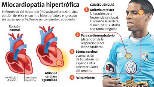En la miocardiopatía hipertrófica, la pared muscular entre las dos cámaras inferiores del corazón se vuelve más gruesa de lo normal. Como resultado, la pared más gruesa puede bloquear el flujo de sangre fuera del corazónHay muchos casos de deportistas que han tenido que dejar la actividad profesional, tenemos casos emblemáticos como es Marcelo Bravo, que tuvo que dejar el fútbol y hoy es director técnico de las inferiores de Vélez Sarsfield, porque tuvo una miocardiopatía hipertrófica. Se detectó y está vivo. Mientras no haga esfuerzos y haga una vida normal, con medicación, no hay mayores problemas. El problema es si hay esfuerzo. Otro hecho fue aquel en el que murió Marc Foé en la Copa Confederaciones en el 2003. Estaba jugando para Camerún y se muere en el medio del campo de juego. Se había en Francia, en el Manchester City y nadie se lo había detectado. Termina falleciendo de una miocardiopatía hipertrófica.