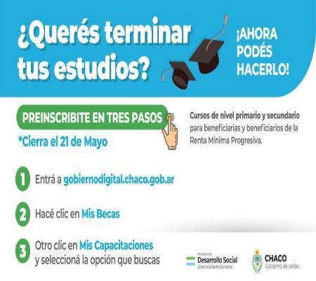 El Ministerio de Desarrollo Social informa a beneficiarios del programa Renta Mínima Progresiva (RMP) que hasta el próximo 21 de mayo está abierta la preinscripción para completar sus estudios primarios y secundarios.La propuesta cuenta con la coordinación con el Ministerio de Educación, Cultura, Ciencia y Tecnología.