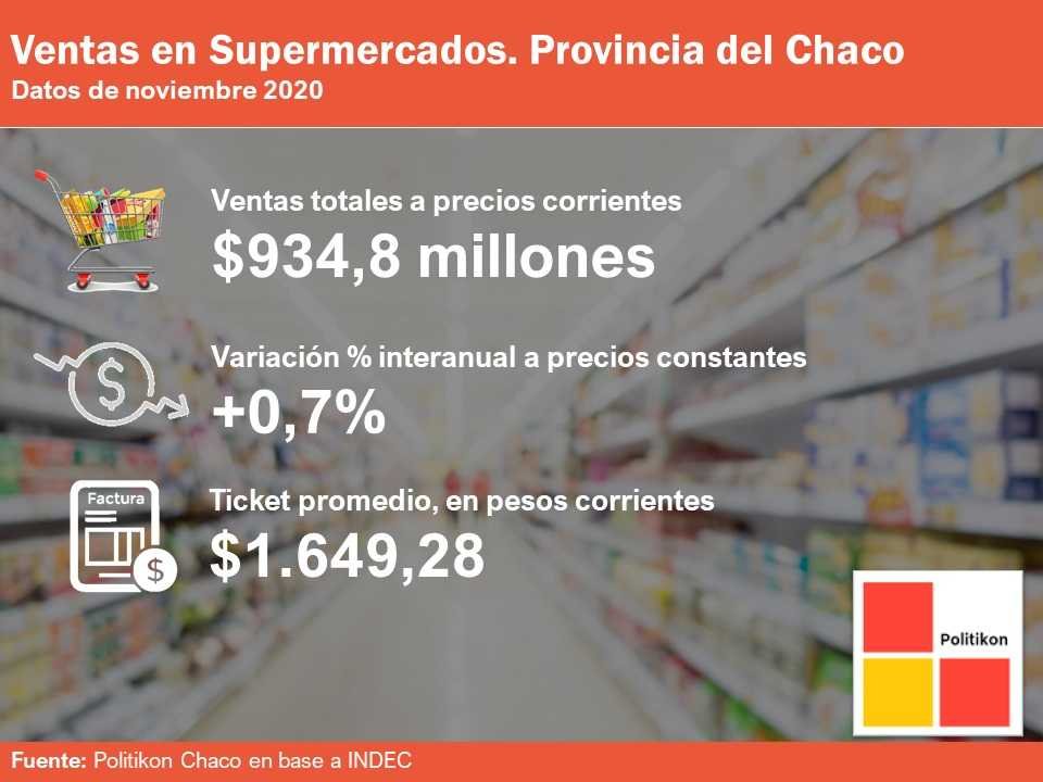 El Chaco tuvo ventas en supermercados por un total de $934,8 millones, el mayor valor en términos absolutos desde que se inició la serie en 2017, y creció un 36,4% a precios corrientes respecto al mismo mes del año anterior; además, si se analiza la evolución a precios constantes (variación real ajustada por alza de precios), se observa un incremento en términos reales del 0,7% interanual, siendo el primer aumento luego de cinco meses consecutivos de descensos.