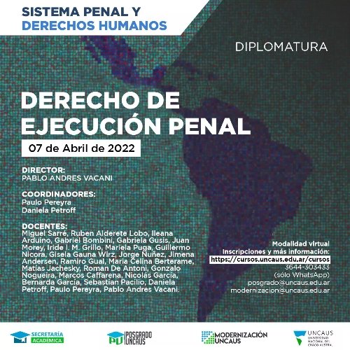 Las clases comenzarán el 7 de abril, con modalidad virtual. Se requiere título de grado para obtener el certificado de aprobación. Más información en la nota.La Universidad Nacional del Chaco Austral (UNCAus), abrió las inscripciones para la Diplomatura en Derecho de Ejecución Penal, una propuesta que se realizará con modalidad virtual y comenzará el 7 de abril de 2022.