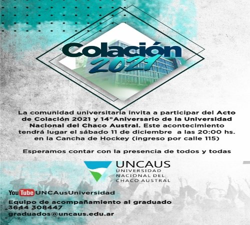 La Universidad Nacional del Chaco Austral celebrará el día sábado 11 de diciembre, a las 20 horas en la cancha de Hockey, el Acto de Colación del año 2021 y el 14° Aniversario de su creación.La Universidad invita a toda la comunidad a participar de este evento, que contará con la entrega de diplomas de parte de autoridades universitarias, a graduados de carreras de pre grado, grado y posgrado.