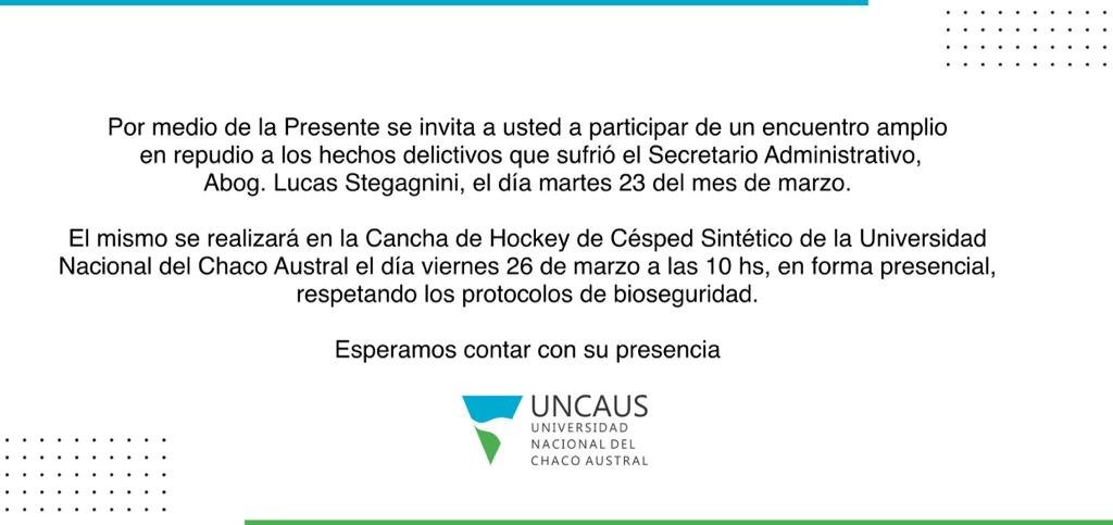 La Universidad Nacional del Chaco Austral se encuentra consternada y en estado de alerta por el hecho delictivo del cual fue víctima el Secretario Administrativo de esta casa de altos estudios Abogado Lucas Stegagnini, el pasado martes 23 de marzo. En razón a ello el día 26 de marzo a las 10 horas se realizará un encuentro en repudio total y absoluto a estos hechos en la Cancha de Hockey de Césped Sintético de dicha Universidad, a las 10 horas en forma presencial respetando todas las medidas de bioseguridad.